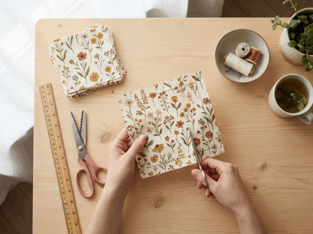 Cut 100% cotton fabric to your desired sizes—8×8 inches for snacks, 10×10 for sandwiches, and 12×12 for covering bowls. Thinner cotton (such as quilting cotton or muslin) absorbs wax more evenly, resulting in a softer, more flexible wrap.