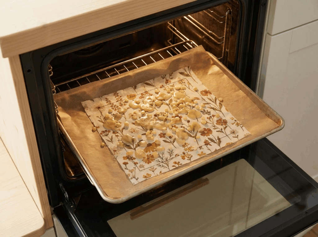 Slide the baking sheet into a 200–225°F (93–107°C) oven for 3–5 minutes. Watch it closely, the wax melts fast.