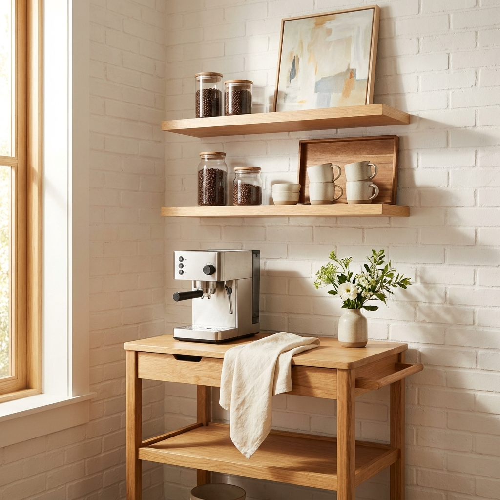 Wall shelves instantly elevate a coffee bar by drawing the eye up and freeing up counter space. They make the setup feel styled and intentional, not crowded. When mugs, jars, or small decor live on a shelf, the coffee bar feels more open and thoughtfully designed without adding more clutter.