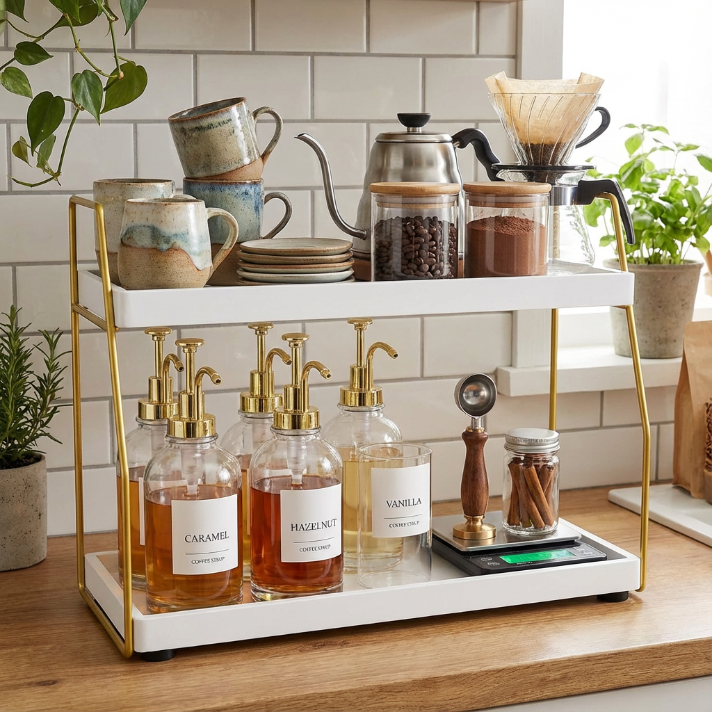 A two-tier counter shelf is perfect when you want more storage without taking up more space. It adds height, keeps everything visible, and makes the coffee bar feel layered and intentional. Syrups, jars, and tools all get their own spot, which keeps the counter looking neat instead of crowded.