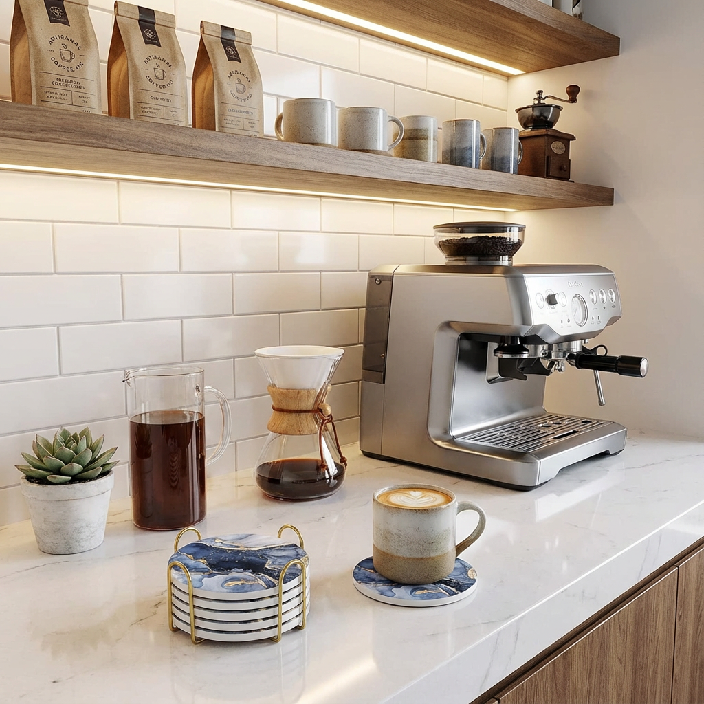These may seem like minor details, but they make a big difference. Marble or stone coasters protect your counters and add a subtle polished touch. Stacked neatly, they make the coffee bar feel finished without trying too hard.