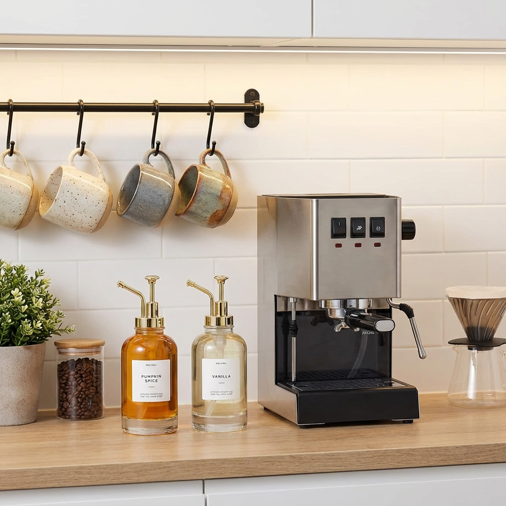 Glass syrup dispensers instantly make a coffee bar feel more pulled together. Swapping out mismatched bottles for matching glass keeps the counter looking clean and styled. It’s a small change that makes everything feel more intentional.