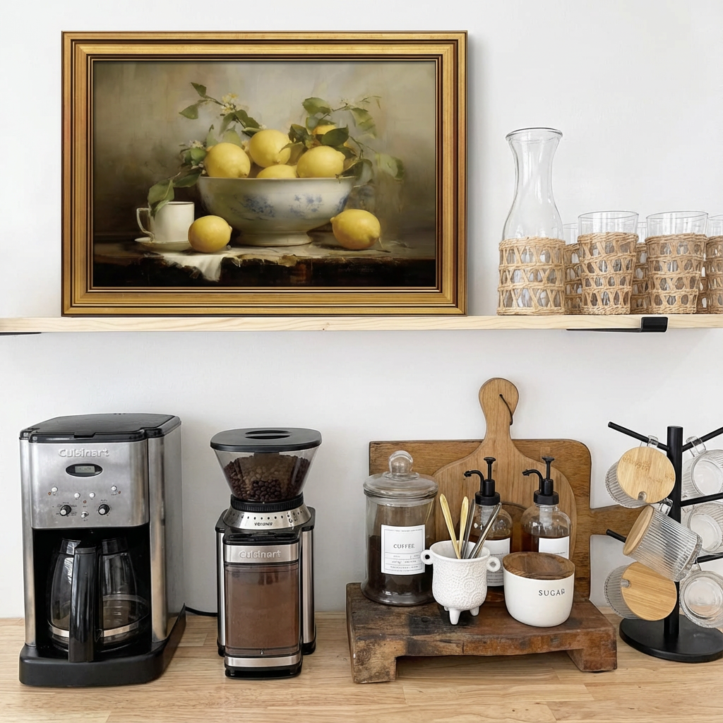 Artwork above the coffee bar helps the area feel complete rather than an afterthought. It draws the eye up and gives the station its own identity within the room. Choosing warm, simple artwork keeps the space feeling cozy and intentional without overpowering the setup.