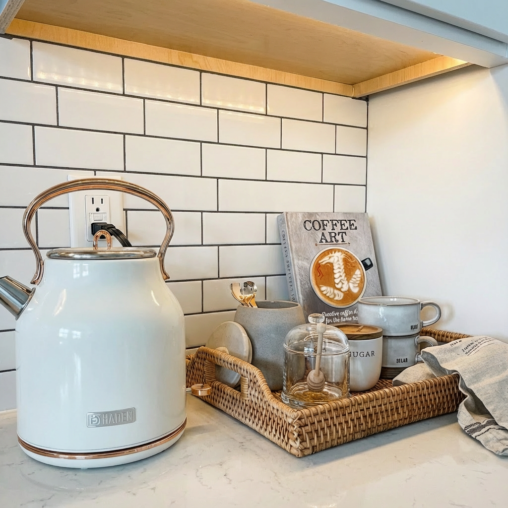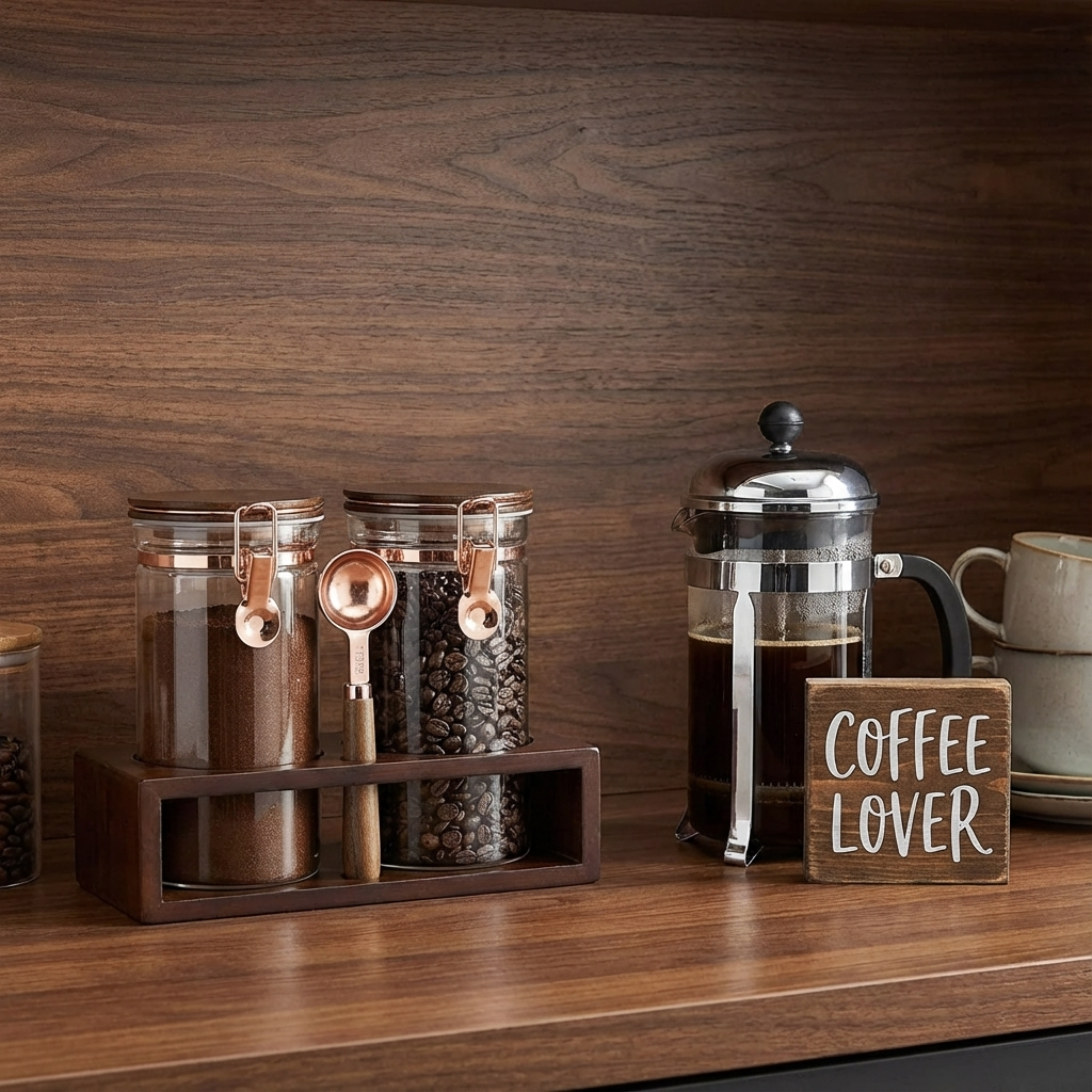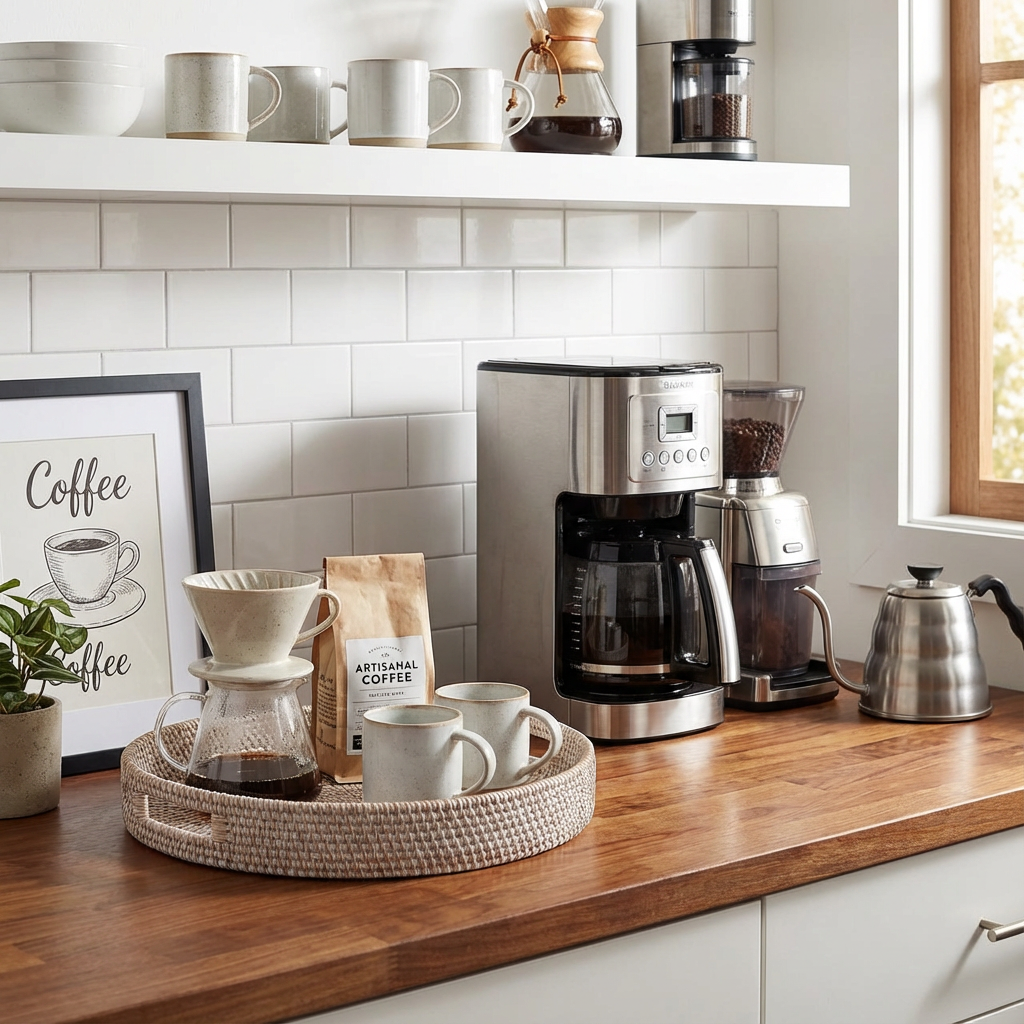 - Essential Appliances and Tools: Start with the basics you actually use. This usually includes a coffee maker or espresso machine, a grinder (if you use whole beans), and simple tools like a scoop or a frother. Choosing streamlined appliances keeps the space modern and prevents visual overload.