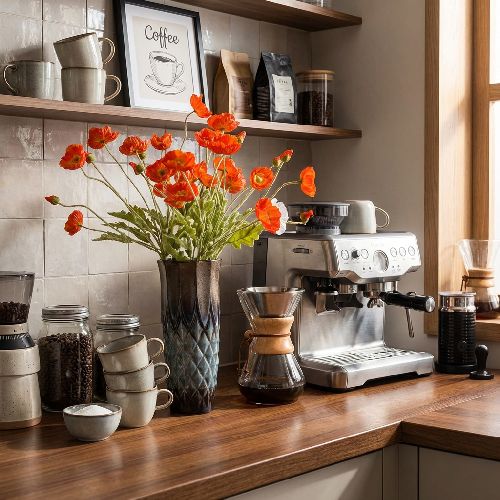 A slight floral touch instantly makes a coffee bar feel warmer and more inviting. Choosing faux flowers made with silk petals and iron wire stems instead of plastic keeps the look more natural and eco-friendly. They add color and softness without extra maintenance or waste.