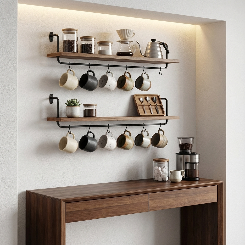 Don’t Miss: Plastic-Free Coffee Makers Creating a modern coffee bar goes beyond design. Discover coffee makers made with stainless steel, glass, and ceramic that reduce plastic exposure while keeping your setup clean and intentional. Read more →7. Wall Shelves That Turn Mugs Into Decor
