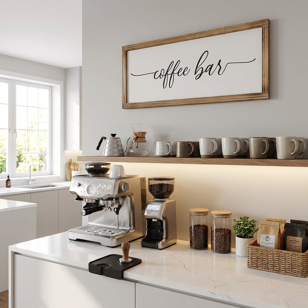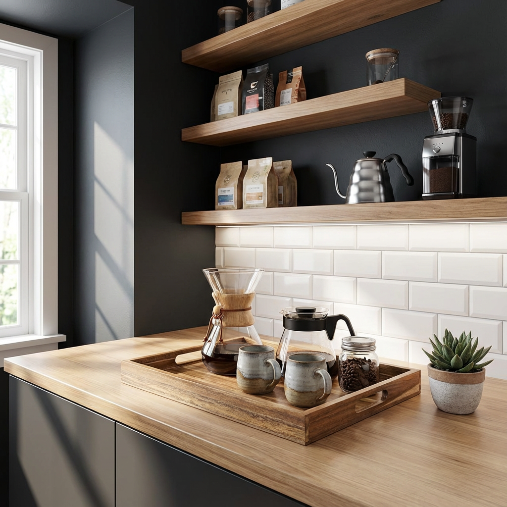 A modern coffee bar should feel organized, uncluttered, and designed around how you actually make coffee. If it feels easy to use and looks pleasant, you’re on the right track.