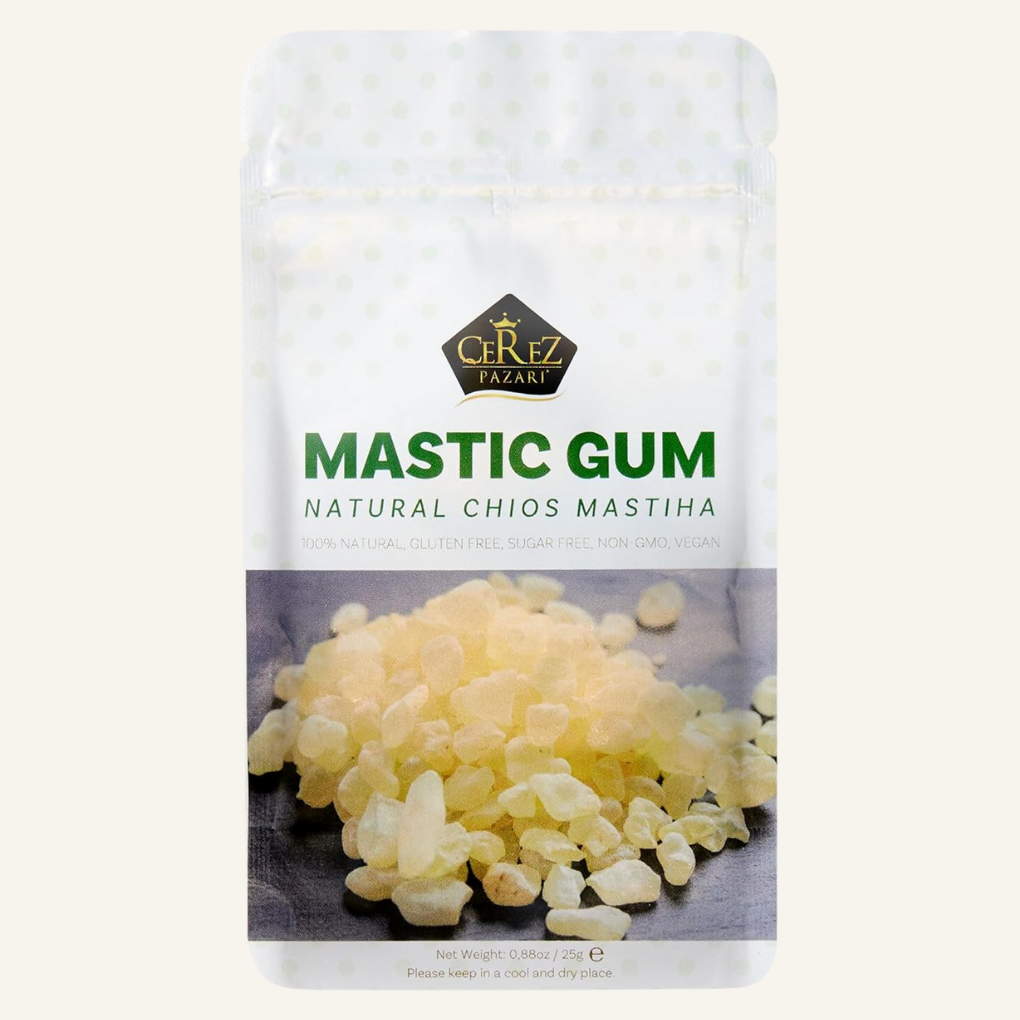 | Cerez Pazari Natural Mastic Gum | Pure Mastic Resin (Chios tree sap) | None — unsweetened natural resin | ✓ | Traditional Greek mastic gum, no additives or flavors, fully biodegradable | Paper pouch or box (varies by retailer) |