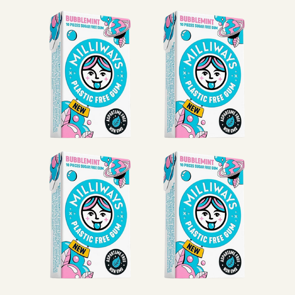 Milliways is a UK-based, plastic-free gum brand known for its clean ingredients and sustainable approach. Made with a natural chicle base, it skips the synthetic polymers used in conventional gum.