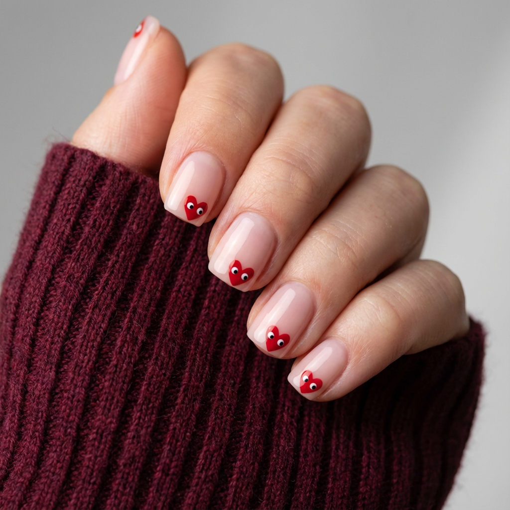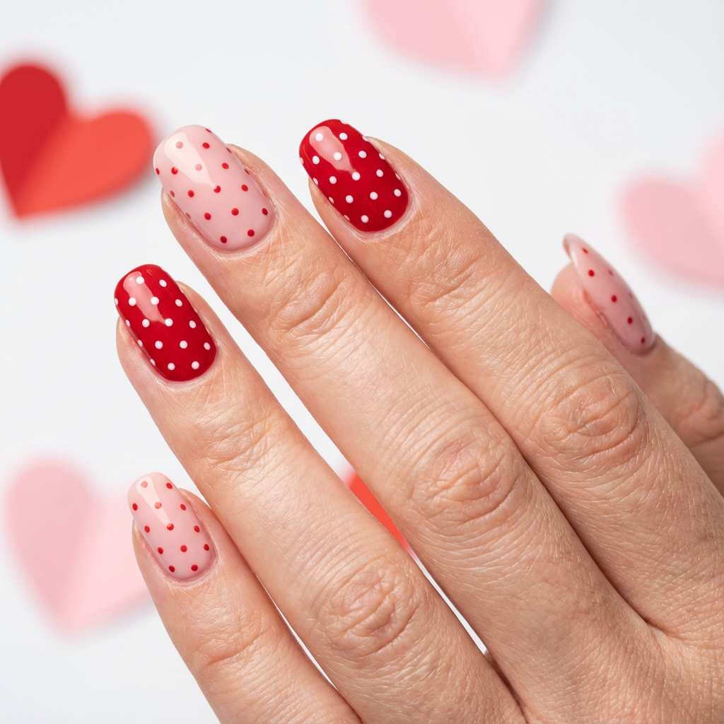 - On the nude nails, add tiny red dots and mini hearts (toothpick or dotting tool).
