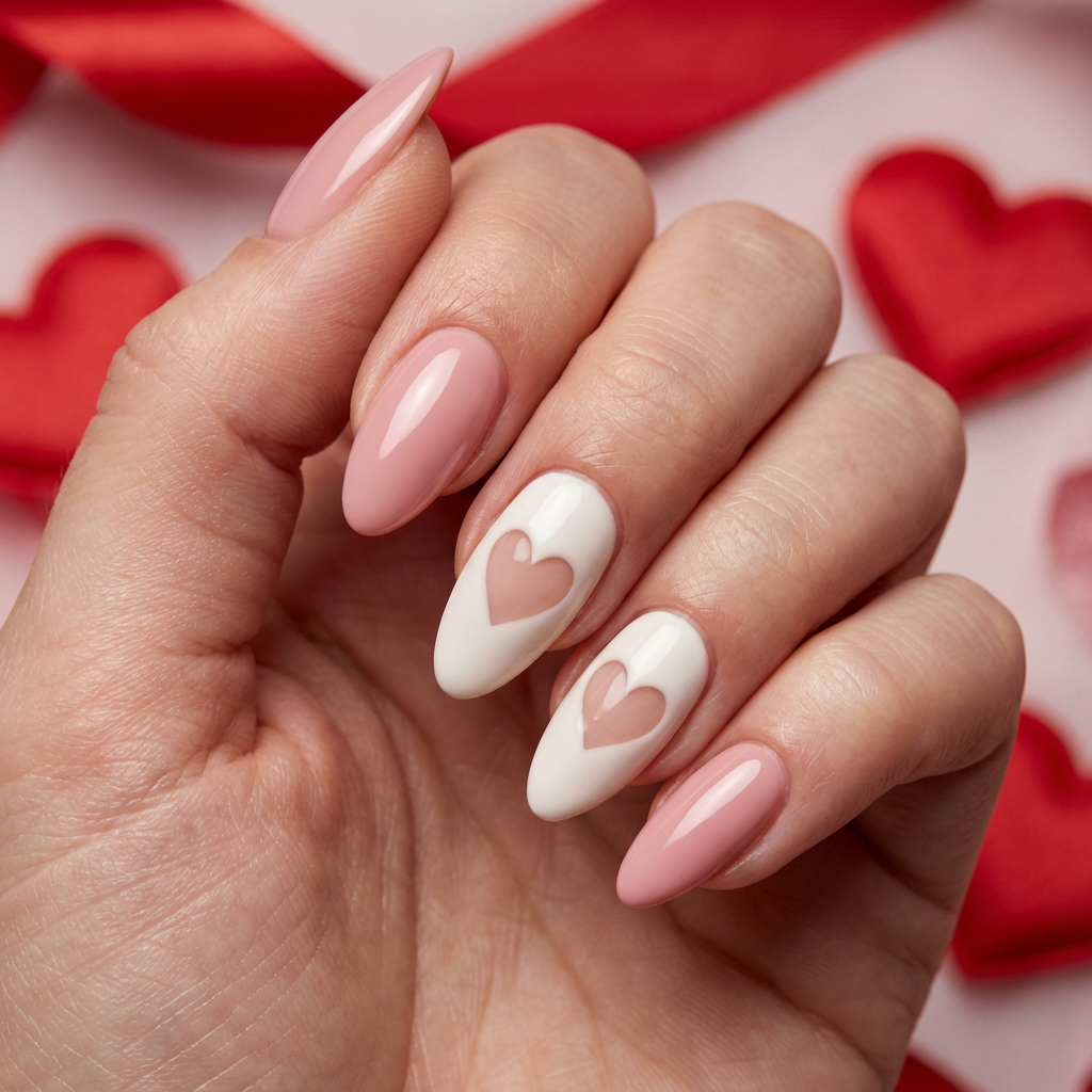 This style works especially well for simple Valentine’s Day nails because it looks intentional without requiring complicated techniques. A delicate pink base paired with tiny cut-out hearts, half-moons near the cuticle, or soft graphic shapes keeps the look light and wearable.