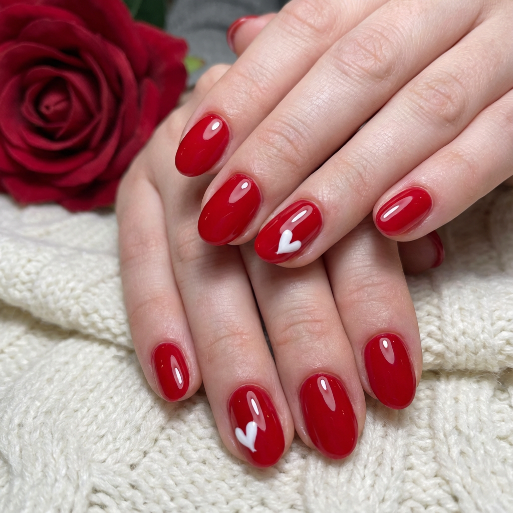 If one nail chips, lightly file the edge, add a light coat of polish, and reseal with a top coat. Simple Valentine designs are easy to fix and still look intentional.