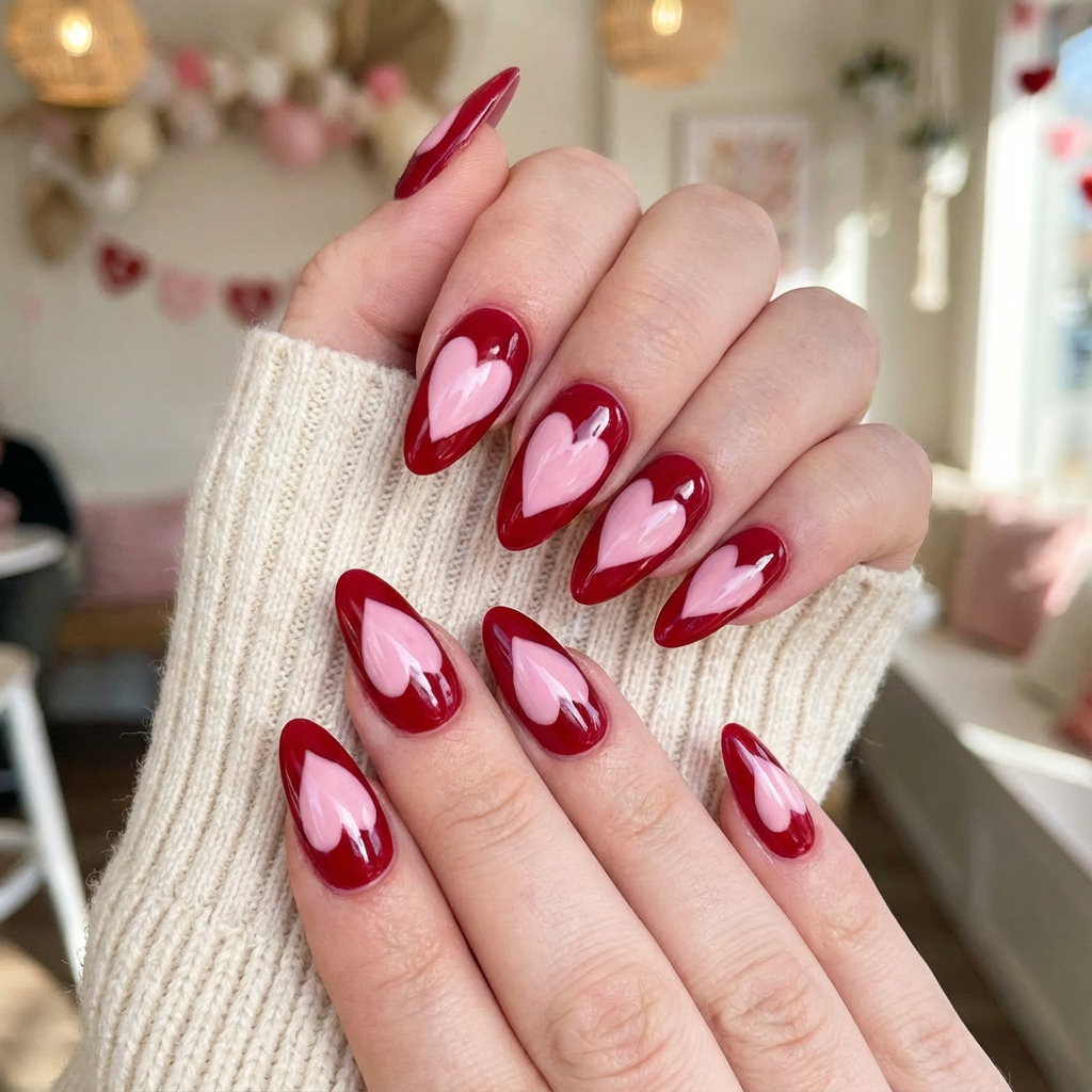 French tips are also one of the easiest styles to customize. You can keep things subtle with pink French tips on almond nails, or add a playful touch with tiny hearts or white heart accents along the tip line. For a more modern take, V-shape French tips or a pointed French manicure create a sharper, fashion-forward look that still feels Valentine-appropriate.
