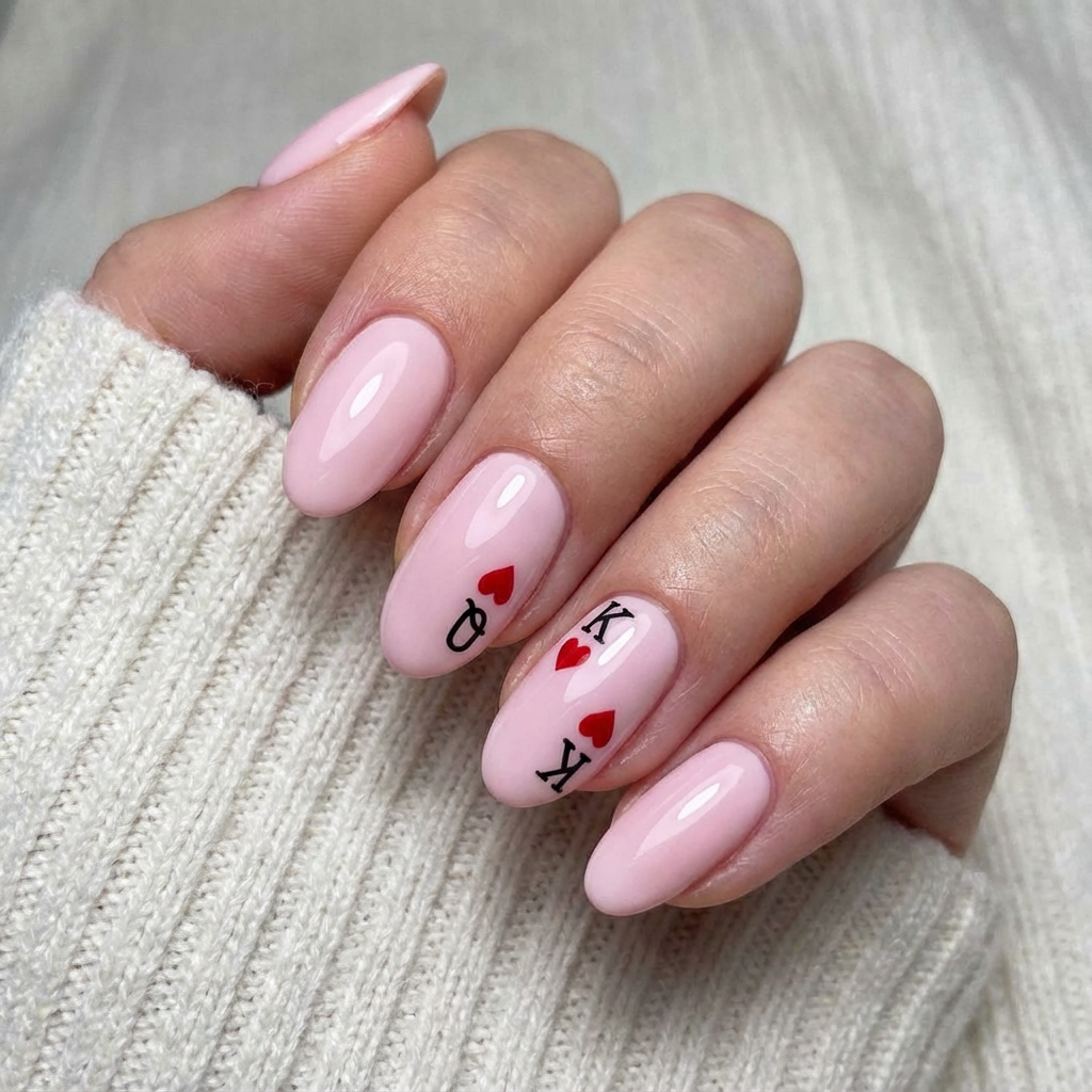 - Using a fine nail art brush or nail stickers, add small black playing card symbols like K and Q, keeping them minimal and well spaced.