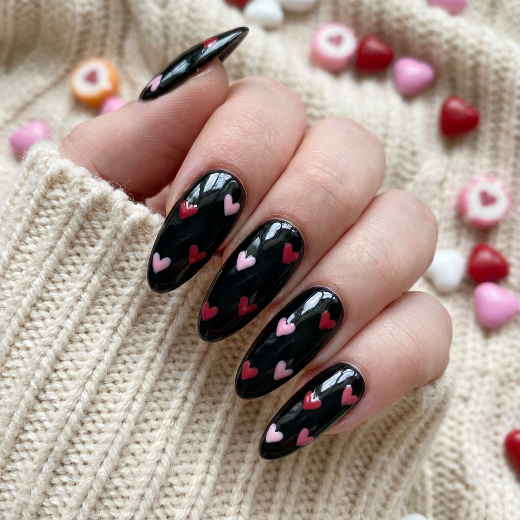 This is your bold Valentine era. The scattered hearts feel fun and flirty, but the overall look stays sleek and fashion-y.