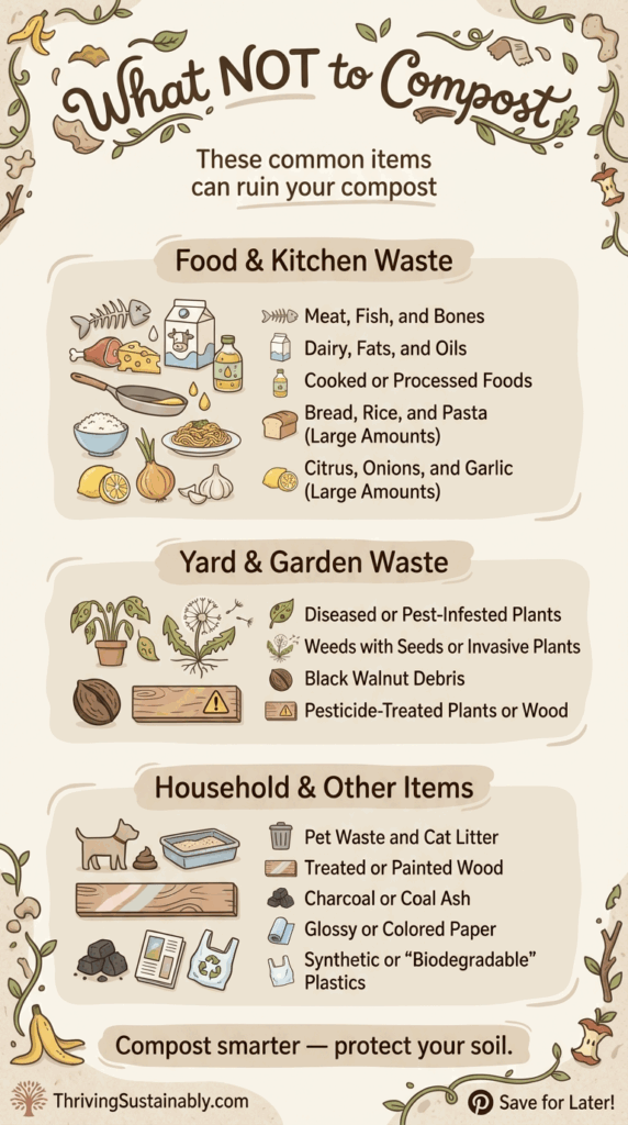 When you skip foods that attract pests, materials that carry chemicals, or plants that spread disease, you’re not doing composting “wrong.” You’re doing it responsibly. Composting less but smarter leads to healthier soil and better results in the long run.